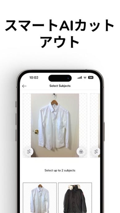 AIで服の背景を自動カットし、15カテゴリへドラッグで登録可能。