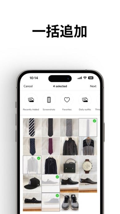 たった15秒で登録完了し、「ワンピース」「トップス」などの定番タグに加え、「仕事」「雨の日」など自由な分類も追加できます。