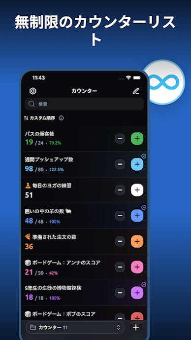複数のカウンターを無制限に作成・切り替え可能で、一覧から目的の項目をすぐ呼び出せるリスト表示が便利です。