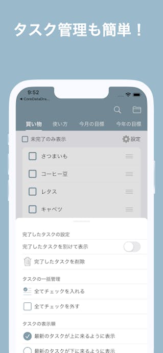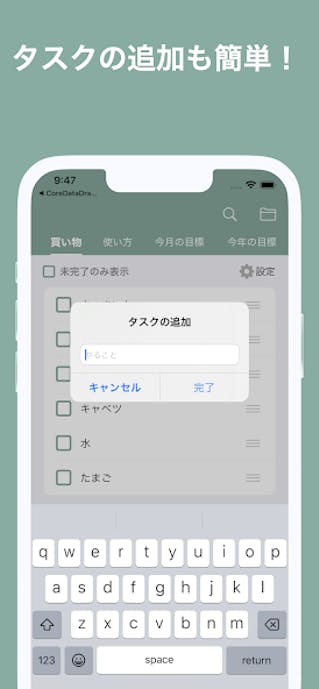 登録したアイテムはワンタップでチェックマークを付けられ、並び替えもスワイプ操作で簡単。