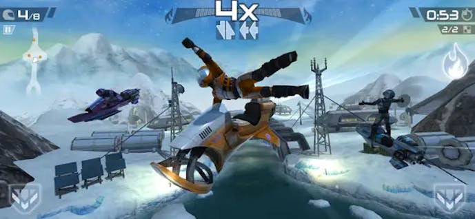 波をタップで駆け上がり、タイミングよく指を離してジャンプ→空中回転でスピードブーストが発動。ランプからの大ジャンプや連続スピンで一気にトップに立つ爽快感がクセになります。