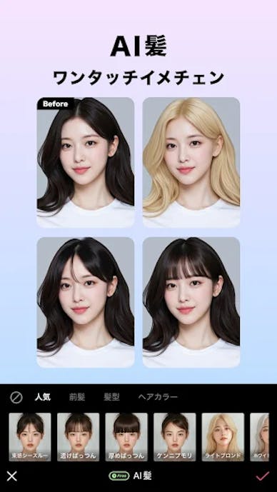 クオリティの高い髪型機能で、理想の仕上がりを実現 微調整から、イメチェンまでできちゃう編集アプリ。 |
