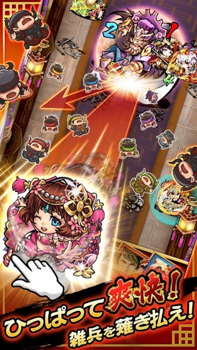 470種以上のちびキャラ武将を集めて部隊を作り、物語にちなんだ“組み合わせ効果”で戦力を高めながら進めていきます。