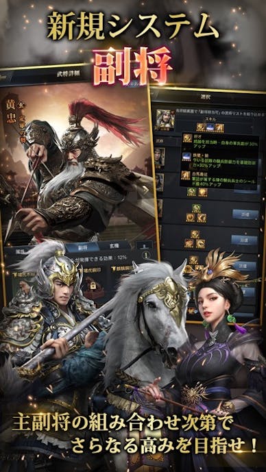 • 育成要素:武将レベルアップ/部隊強化/装備・神兵・乗騎の収集強化/スキル活用
