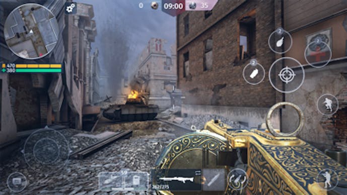 画面右の射撃ボタンと左スティックで直感操作ができ、照準アシストやスコープ切替にも対応。