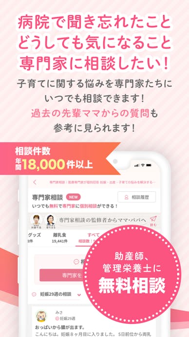 また、経験豊富な助産師や管理栄養士に直接質問できる「専門家相談」機能があり、授乳や母乳・ミルクの悩み、離乳食の進め方まで気軽に相談できますよ。