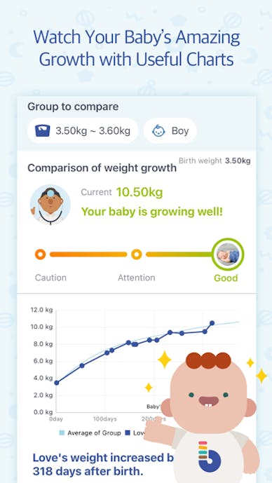 成長曲線で身長・体重の流れを確認でき、修正月齢表示にも対応しています。
