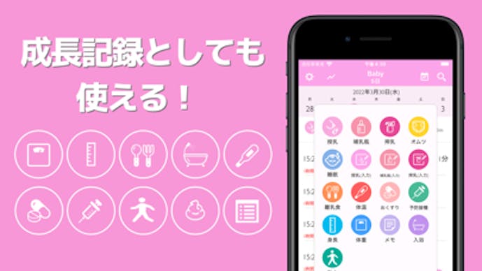 母乳や粉ミルク、離乳食の量も管理でき、記録の抜けを抑えやすい設計。