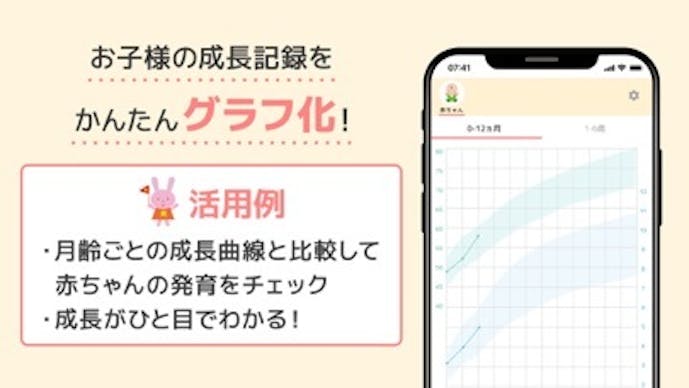 身長・体重は成長曲線で確認でき、家族とのリアルタイム共有や複数の子の切替、バックアップにも対応。