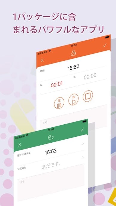 ワンタップで授乳・ミルク・搾母乳を記録でき、授乳タイマーで左右の順番まで管理。